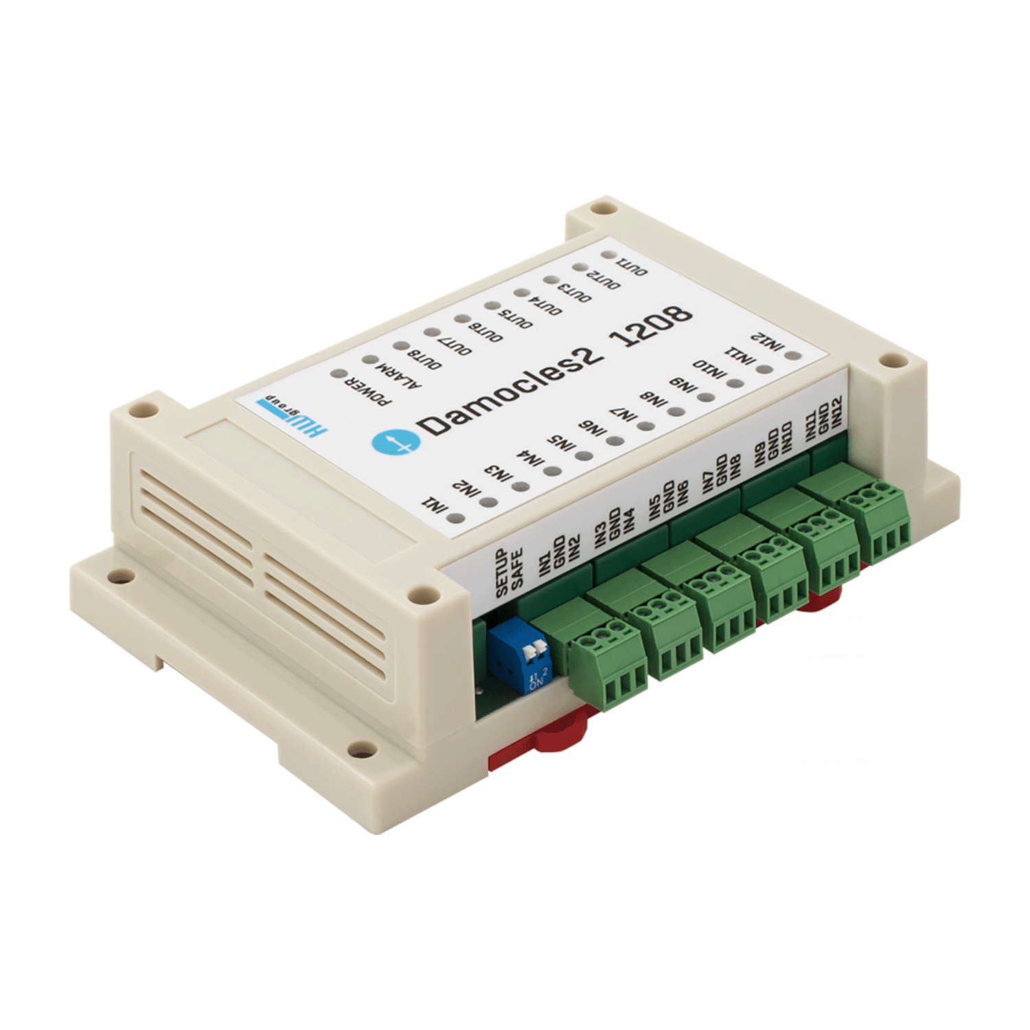 Input state changes can trigger alerts via email, SNMP Traps, or SMS (via SMS-GW), and the device can also activate remote relays on another Damocles2 or Poseidon2 unit.