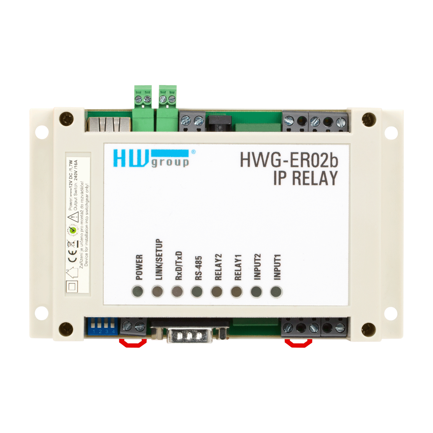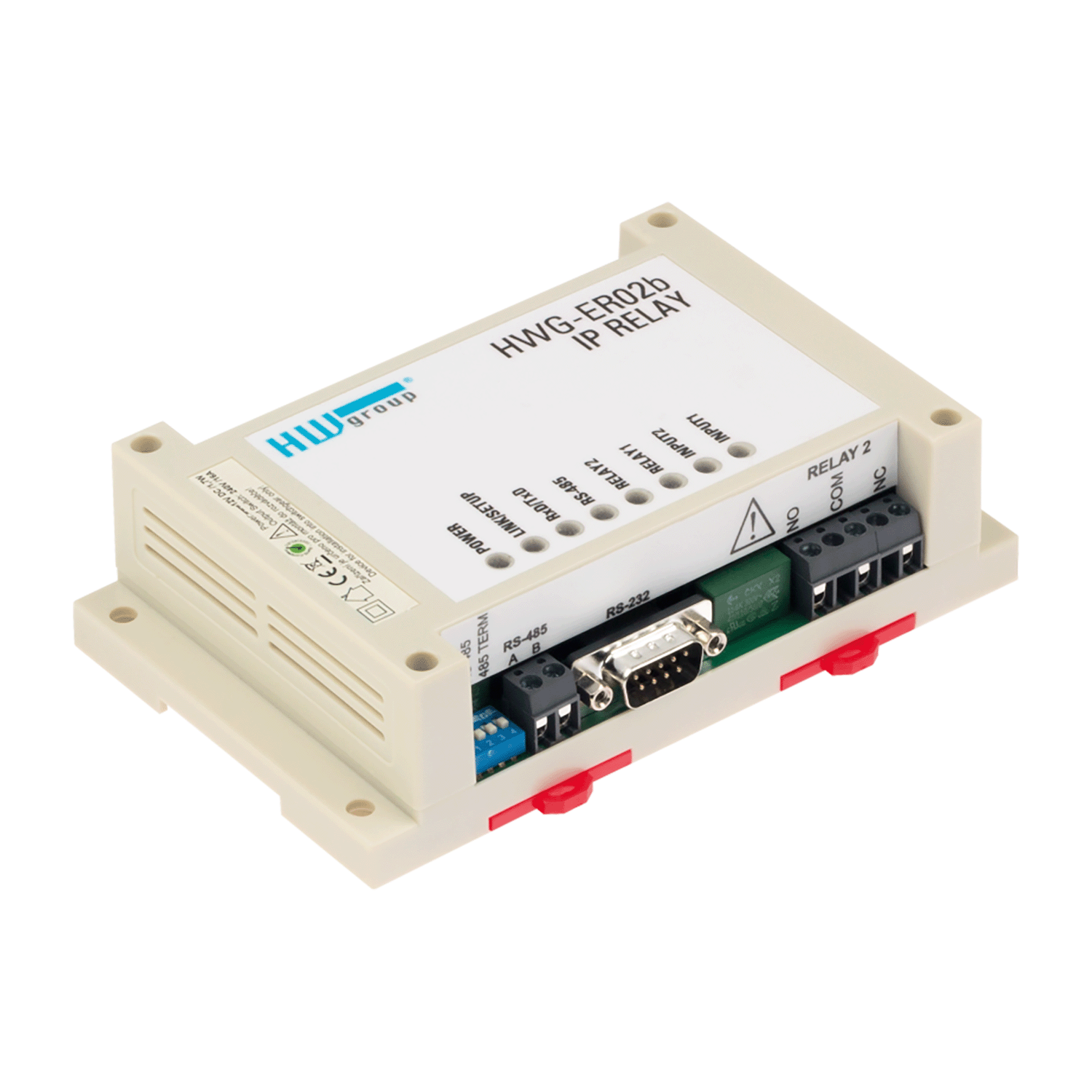 The IP Relay HWg-ER02b is a network-connected relay controller that allows remote control of digital outputs and serial devices over Ethernet. It features two digital inputs for monitoring dry contacts or switches and two relay outputs capable of switching 230V/16A loads.