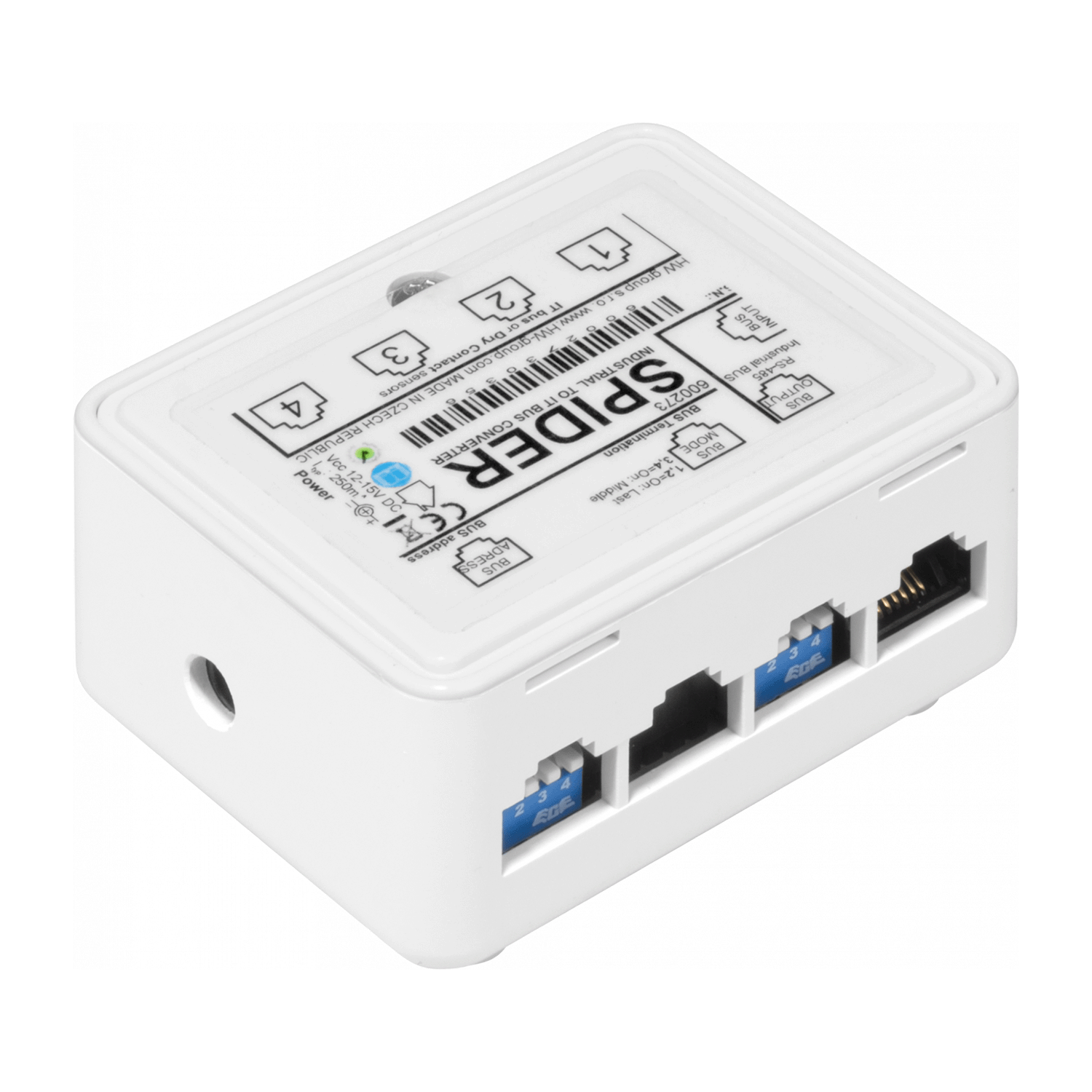 The device includes a DIP switch to easily set the address for each connected unit on the RS-485 bus, making configuration quick and simple. It also features signal indication for when a sensor value is being read or when a dry contact is switched. With the ability to react to extremely short dry contact pulses (as brief as 30 ms), the Spider offers excellent flexibility for various use cases.