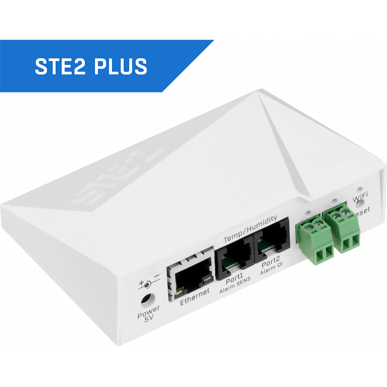 The STE2 PLUS is a versatile remote monitoring device designed for temperature, humidity, and environmental sensing. It features two RJ11 ports supporting up to 15 sensor values and two digital inputs (DI) for dry contact detectors.